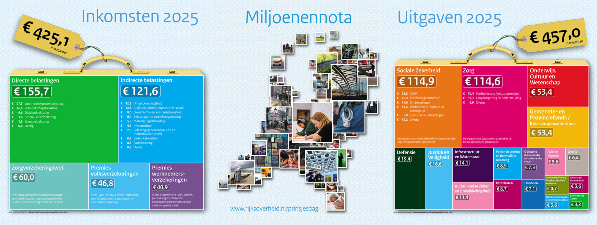Aan het begin van de 20e eeuw waren de taken en de rol van de overheid beperkt. (Defensie en nationale schuld vormden toen twee derde van de totale uitgaven). Een eeuw later is er sprake van een uitgebreid takenpakket en voorzieningen waar de overheid voor zorgt. Sociale Zekerheid en Zorg zijn nu de grootste uitgavenposten op de begroting, gevolgd door onderwijs en het geld dat voor uitvoering van overheidstaken naar gemeenten en provincies gaat. In de naamgeving van de posten is enigszins te zien welke rijkstaken er in de loop van de 20e eeuw nog meer zijn bijgekomen.
