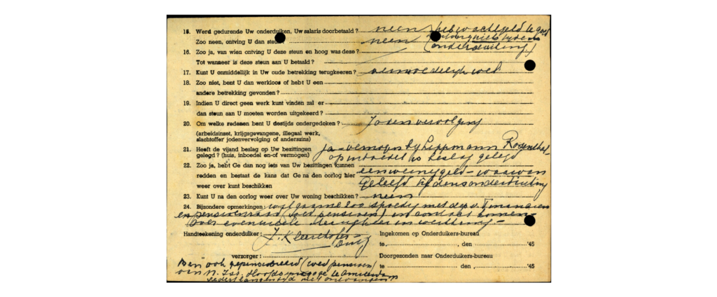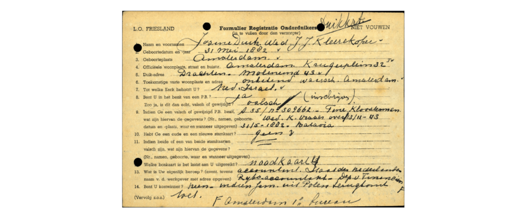 Mrs Kleerekoper went into hiding in Drachten with a fake identity card and survived World War II under the alias Tine Kloosterman. On her onderduikerskaart (registration card for people in hiding), her answer to the question of whether she would get her old job back was: ‘most probably’. And she said she would be the breadwinner when her family returned from Poland. And indeed, on 16 July 1945, she regained her old position as accountant at the 1st Bureau of the National Audit Office in Amsterdam. However, her relatives had died in Auschwitz and Sobibor.