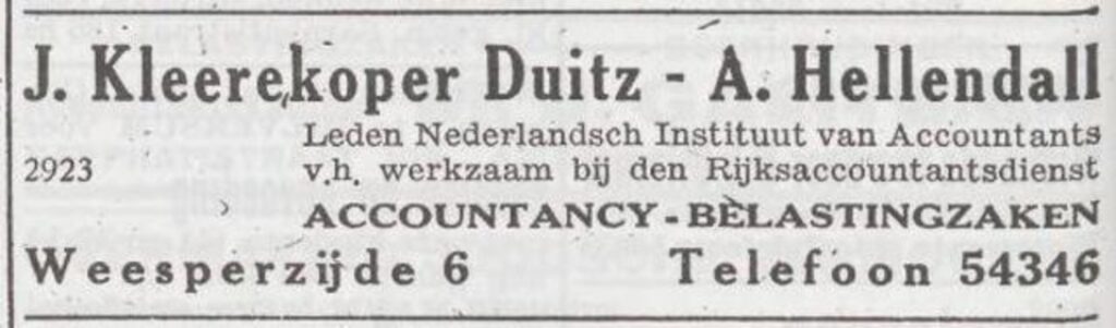 She responded to this injustice by opening her own office at Weesperzijde 6 in Amsterdam – where she also lived – with a colleague who had been similarly dismissed, Deputy Accountant A. Hellendall. This venture was destined to fail: all Jewish life in Amsterdam would be destroyed.