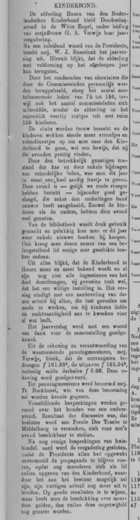 Not much else is known about Miss Enserinck. We do know that she also used her accounting skills for a good cause. An article in the Hoornsche Courant (local newspaper) on 1 February 1913 reveals that she drew up the annual report for the Hoorn branch of the Nederlandsche Kinderbond (Dutch Children’s Association). The aim of the association was to ‘nurture love and justice for all living things’.
