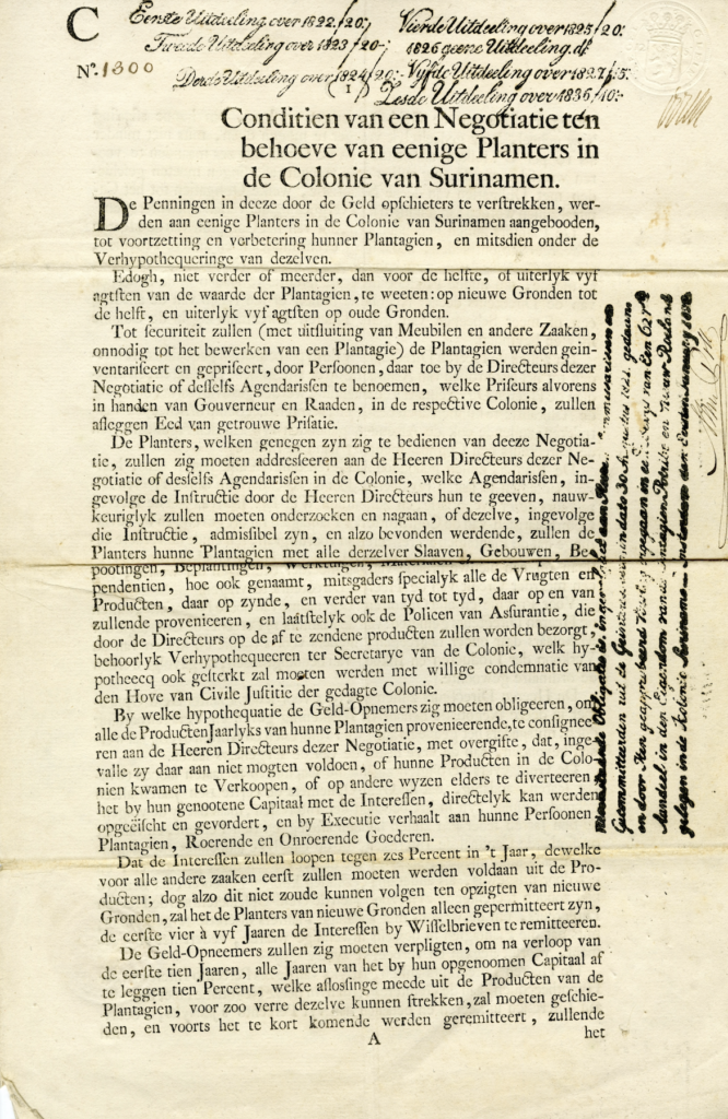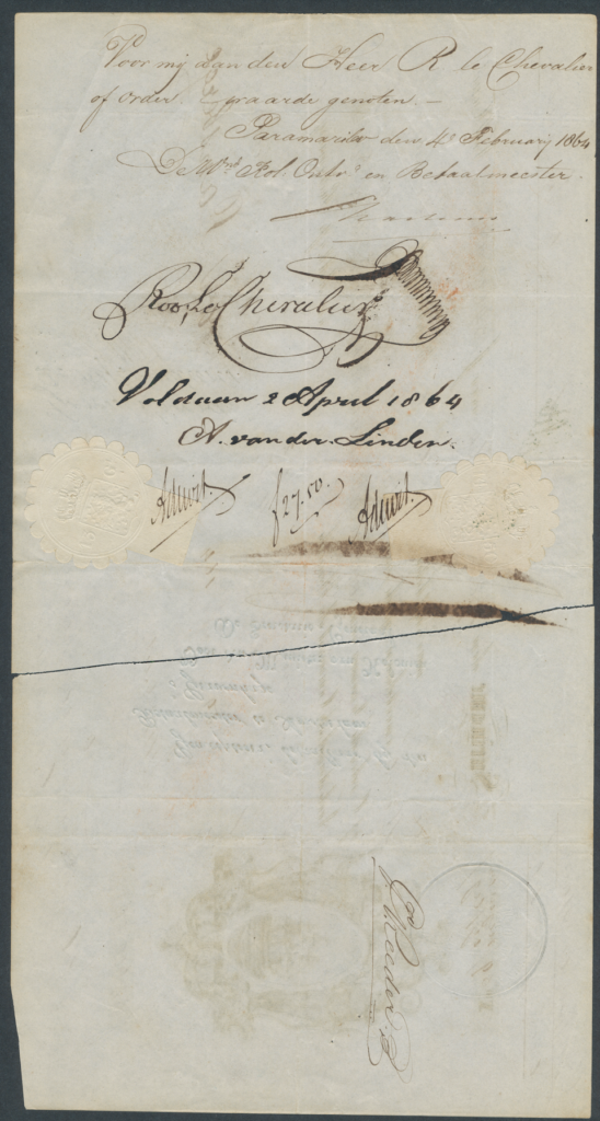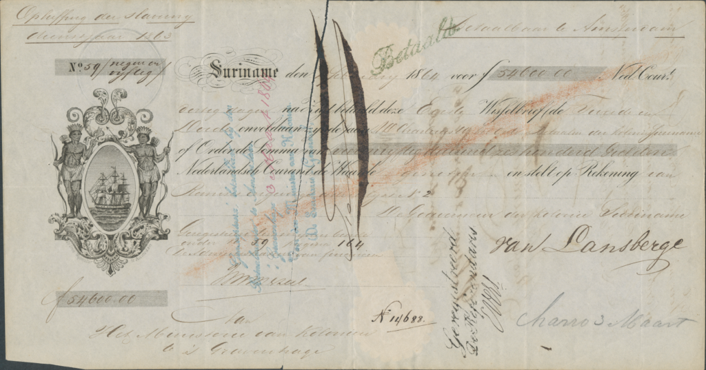 Een ‘slavenwissel’, f 54.600,- compensatie voor het verlies van gratis arbeidskrachten, Suriname 1864
