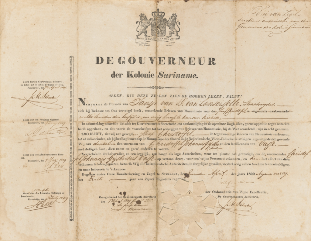 Manumissiebrief voor Christoffel Vasse, Suriname 1849