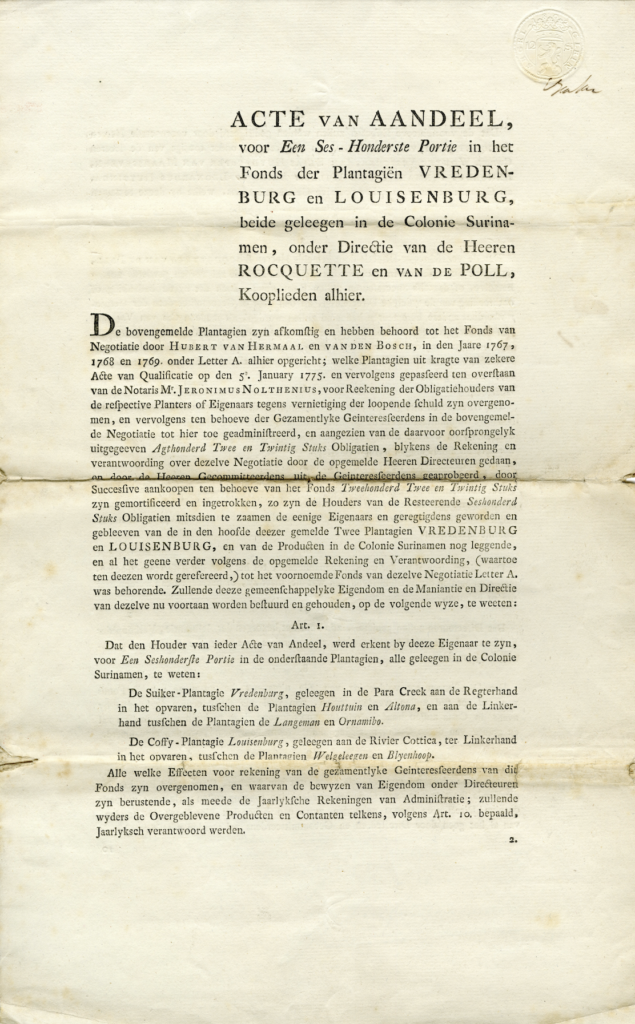 Bewijs van een zeshonderdste aandeel in de plantages Vredenburg en Louisenburg in Suriname met een zegel van 12 stuivers, Amsterdam 1810